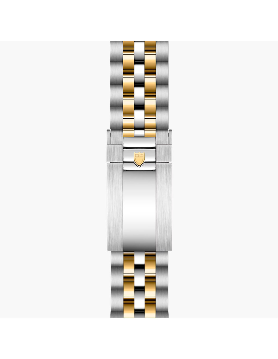 Yellow gold center links at 6 and 12 o’clock. Remaining center links in steel covered by a 0.2mm 18 ct yellow gold cap. "T-fit" folding clasp with safety catch. The logo on the catch is made of yellow gold
