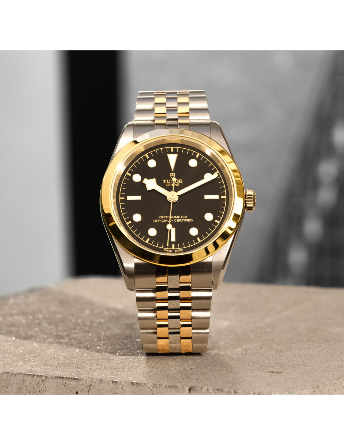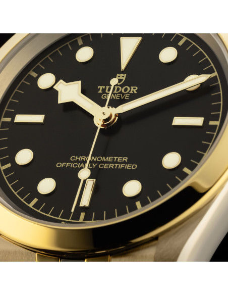 Screw-down winding crown with the TUDOR rose in relief. Steel covered by a 0.1mm 18 ct yellow gold cap