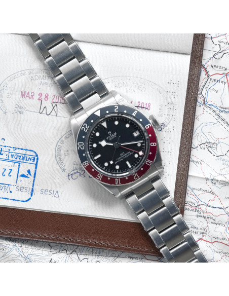 Bisel giratorio bidireccional de acero con 48 muescas, disco de aluminio anodizado azul mate y burdeos mate, con graduación de 24 horas