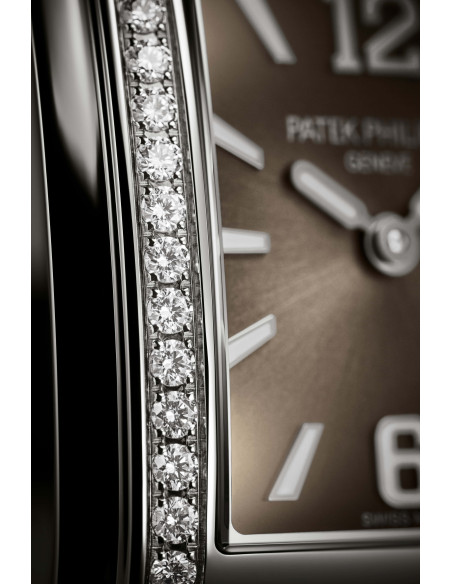El Twenty 4 de cuarzo estilo manchette de talla mediana vuelve con fuerza en dos nuevas versiones en las que los números romanos han dado paso a las cifras arábigas aplicadas en oro y los índices de diamante a índices “trapecio” igualmente de oro. Un rostro atemporal y muy contemporáneo para un reloj destinado a compartir todas las horas de una vida activa. Este modelo de acero se ofrece con una esfera azul “sol” o gris “sol”. La corona está ornamentada con la cruz de Calatrava, emblema de Patek Philippe.